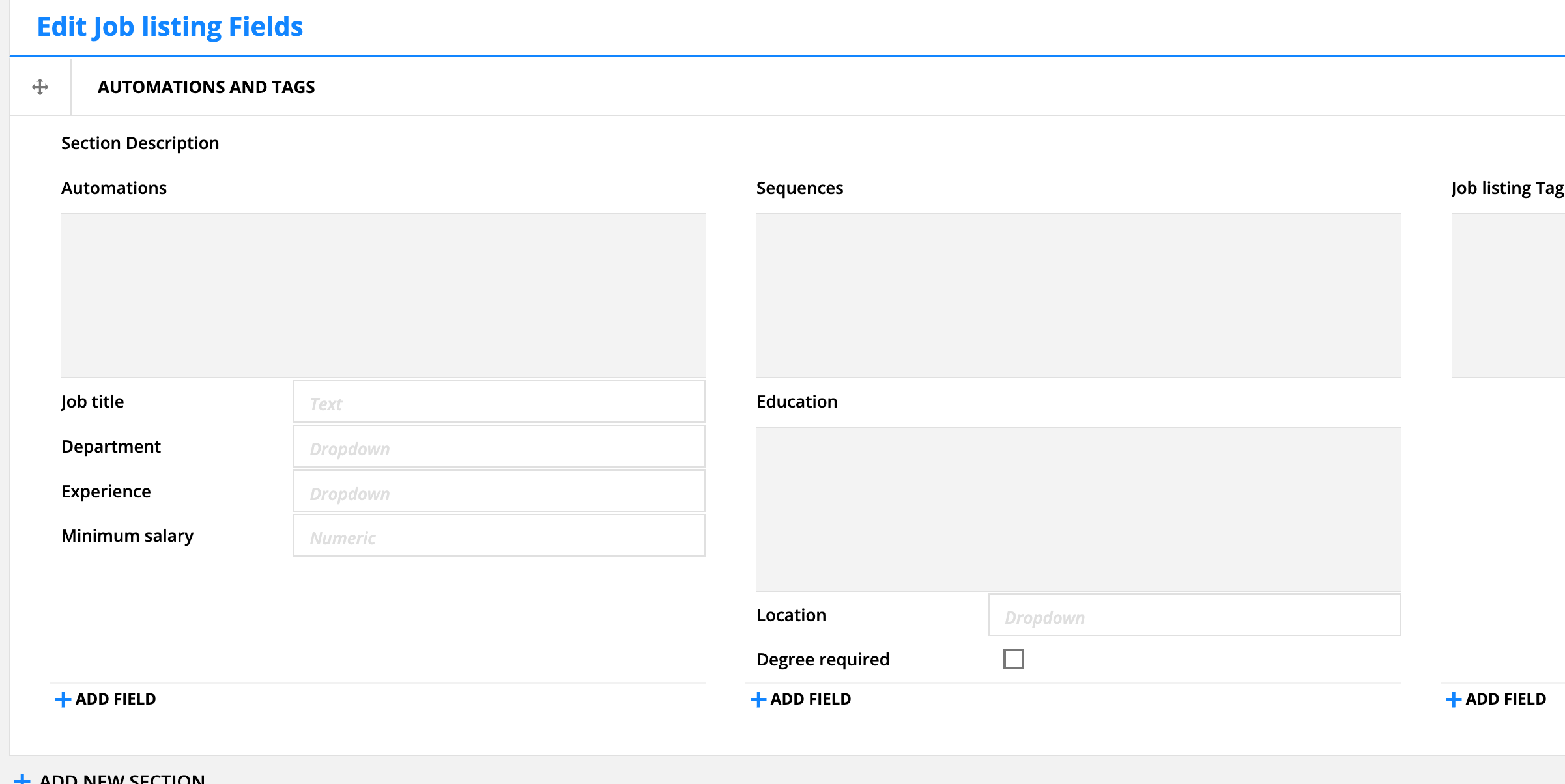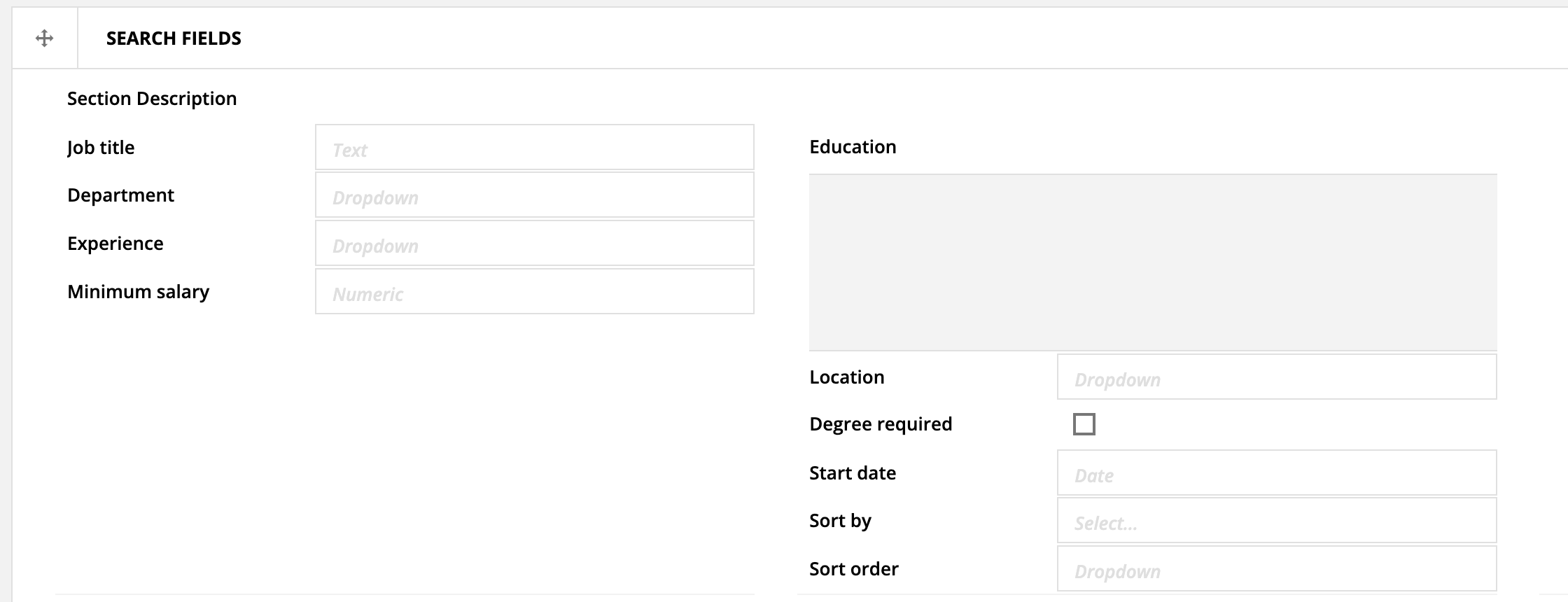 12 We also have two additional fields called 'Sort by' and 'Sort order'. You may have noticed that these fields weren't in the Job listing object. That's because these fields and the corresponding values will allow us to sort by a particular field, and sort either ascending or descending. And they don't need a value in the record object to make this work. We just need these fields in the Contact object in order to make them work off of the form submission. In the sort by field, we have "Department" and "Salary". In sort order, the values are "Ascending" and "Descending".